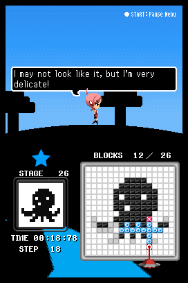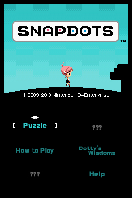 DSi Points: 500Welcome to Snapdots! Complete dozens of puzzle pictures by rotating the puzzle to find the best angle and shooting blocks from your UFO. If the placement isn't quite right, use the UFO to retrieve blocks and shoot them in different spots. Adding to the challenge, puzzles often contain several types of blocks and spots, each with its own characteristics. Journey to multiple planets to tackle puzzles individually in Puzzle mode, or try to clear as many puzzles as you can within a time limit in the frenetic Time Attack mode. In either mode, strategy and action combine to create a classic puzzle game that definitely hits the spot.