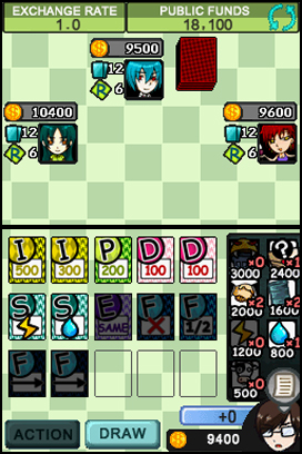 DSi Points: 500/200 (JP)Once a big-time boss, you are now down and out, forced into the small time after your company was driven into bankruptcy by an underhanded competitor who stooped lower than even you would dare. Of course, revenge is a dish best served cold — over a drink at an expensive club, which is where the game takes place. Rebuild your fortune and show your competitor who's really the boss. This is a witty card game with a few simple rules to test your intelligence. Starting with a small amount of resources, money and action cards, try to use those cards to cunningly step forward until you have sold all of your resources to others. Set strategies in motion to increase the value of your resources. Don't forget: Your ultimate goal is to introduce your competitors to bankruptcy.