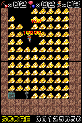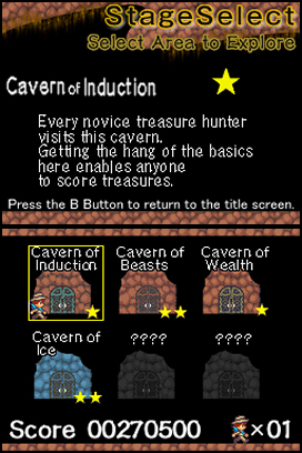 DSi Points: 200/500 (JP)The risk is great and the rewards are even greater. Many untouched caverns still exist in the world, just waiting for someone brave enough to explore them. Within them lie vast troves of treasure and rare artifacts. As Tyrol the treasure hunter, you must collect treasures and escape from the caverns. Be warned: There are creatures lurking in the depths of the caverns, and the element of nature is against you. Use your pickaxe wisely so you don't get trapped and lost forever within the darkness of the caverns. Can Tyrol collect enough treasure in order to win the heart of the woman he loves?