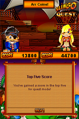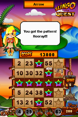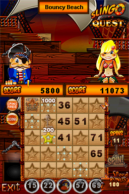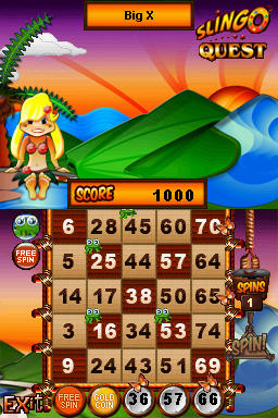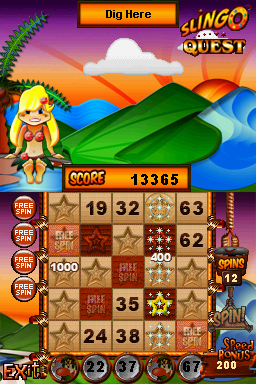 DSi Points: 800Slingo Quest combines two classics - slots and bingo - in the ultimate puzzle game. Spin the traditional five-reel slot machine, then match the numbers on your cards (across, down or diagonally) and hit a Slingo. Create as many Slingos as you can in 20 spins with the help of fun power-ups. Fun game modes include Multi-Card Slingo, Seven by Seven Slingo and Pirate's Fortune Slingo. Collect cool power-ups, including Slingo Vision, Devil Protection and Multipliers. Play through 50 fun levels of Slingo, collecting Slingo Stars and Stamps for big bonuses. Are you ready for the next Slingo challenge?