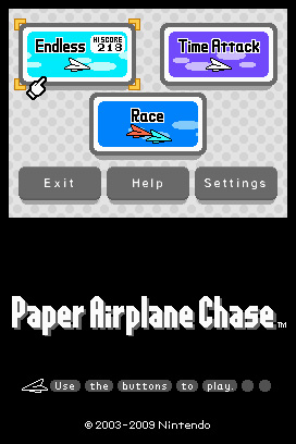 DSi Points: 200In Paper Airplane Chase, glide your virtual paper plane through an increasingly tricky slalom course. Take it slow in Endless mode or zip through several Time Attack courses. The two-player Race mode allows friends to race each other using a single Nintendo DSi system.