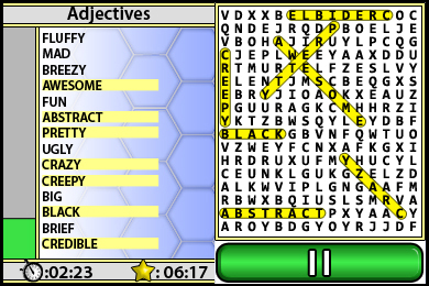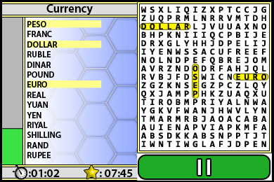 DSi Points: 500You'll need a keen eye and a quick mind to complete 100 themed word-search puzzles. Word Searcher 3 contains fun words from multiple categories including astronomy, currency and rivers. Packed with a huge assortment of subjects to choose from, there's sure to be a puzzle anyone can enjoy. Keep your vocabulary, memory and problem-solving skills sharp with these challenging puzzles. Keep track of - and try to beat - your own play-through times again and again as words are scrambled every time you play.