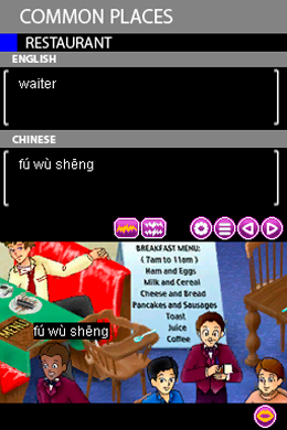 DSi Points: 800Play & Learn Chinese is the fast, fun, and friendly way to learn to speak Chinese! Get ready for an exciting and entertaining challenge as you match the pictures to the words you hear, and see how high you can score. You’ll be surprised by how much Chinese you’ve learned while you play! Over 700 words and phrases with entertaining visuals help you learn quickly and speak with confidence. Listen to and speak aloud Chinese words and phrases while you explore settings such as the supermarket, restaurant, and city streets. Play & Learn Chinese is easy and effective for beginners and travelers and a fun refresher for advanced and intermediate speakers!