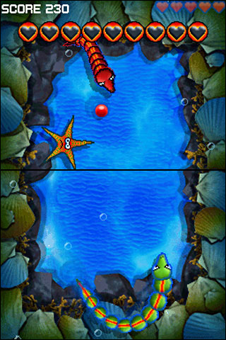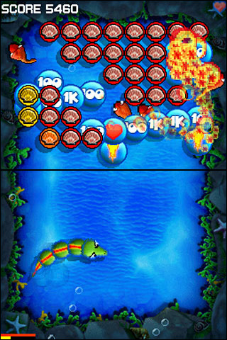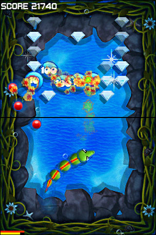 DSi Points: 500The game is an unique blend of classic game concepts. Using the stylus the player controls a snake on the lower screen and tries to use it to bounce the ball destroying boulders on the upper screen. In each level the boulders are organized in a different shape. At the same time the snake has to avoid enemies and may collect bonuses, falling out of the destroyed boulders. The aim of the game is to finish all the levels with the most points. The snake controlled by the player is composed of flexibly connected segments which bounce the ball.