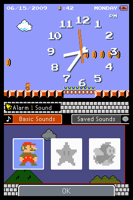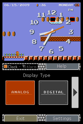 DSi Points: 200Turn back time and enjoy a bit of classic game play based on the original Super Mario Bros. with Mario Clock. Help Mario and Luigi collect more coins than ever (POW block anyone?) while they run through a variety of stages. Gather enough coins and you'll be treated to another scene bound to bring back fond memories for many. Mario Clock includes both analog and digital clocks that use the system's internal clock or allow you to offset the time however you like. Program up to three alarms (with snooze functionality for those that need it) and assign them a Mario-related sound or use one created in the Nintendo DSi Sound application. You'll find yourself thinking "Just a few more coins..." in no time!