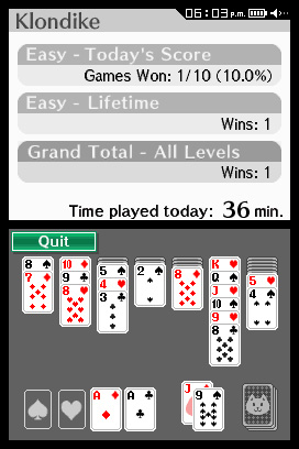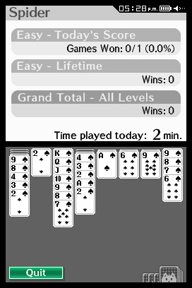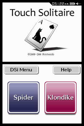 DSi Points: 200Touch Solitaire features two of the most popular versions of the world-famous card game - Spider and Klondike - with simple touch-screen controls and an easy-to-understand interface. In Spider, the aim is to arrange cards in piles of a single suit from King down to Ace, thereby removing the pile from play. When all cards are removed, you win the game. The goal of Klondike is to arrange cards from Ace to King in piles, one for each suit, on the four foundations. You win when all cards have been moved to the foundations. Various difficulty levels are available for Spider and Klondike, allowing beginners or experts to enjoy the game at their own pace.