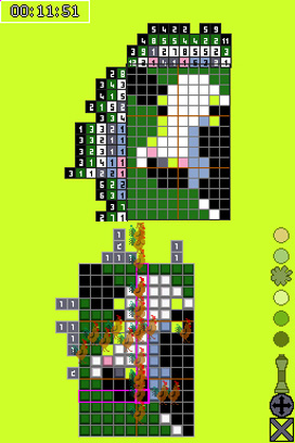 DSi Points: 500Get hooked on colorful puzzles. The goal of the game is to reconstruct a mysterious animal image that lies beneath the grid. You just need to fill in each square of the grid with one of the appropriate colors available. To solve the puzzle, you can simply deduce the right color by using the numbers written around the grid. Don't worry, a short tutorial shows you the basic rules within a minute. Puzzle-solving champs, sudoku fans or even kids can enjoy the game. You can play 72 individual grids in up to 50 hours of game play. Players can select among eight levels presented as geographical zones including Europe, Oceania, North Pole, Pacific, North America and South America to discover local fauna. Enter a new world filled with fancy colored pixel art.