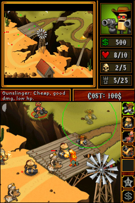 DSi Points: 500Welcome to Cowbot County, home of the robotic master race of SteamWorld! As the sheriff, you must stop the human invaders in their mad hunt for gold. Build attack robots next to the roads they roam, then watch the invaders go down. Use your robots' special skills to your advantage in this original tower defense variation where strategy and execution are equally important. There's an Easy mode for rookies, but everyone will find a unique challenge in the great Western reaches.