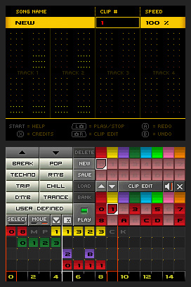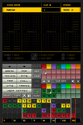 DSi Points: 800Rytmik is an application for creating rhythmical and melodic themes and composing whole songs. It contains more than 170 carefully selected sound samples of drums, cymbals, percussion, bass and melodic instruments. With Rytmik you can quickly and easily create the basic building block: an audio clip. It consists of musical notations for up to four instruments that you may transpose, select their location in the stereo field and modify their volume, polyphony and echo. You can arbitrarily combine as many as 128 clips in four tracks to create complex pieces of music. You also have a rhythm library with a varied collection of 16 pre-made compositions that can be used to help quickly compose your own pieces. For the best musical experience, we recommend connecting headphones or a quality speaker system (not included).