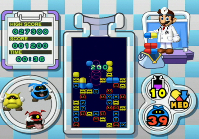 The regular game of throwing multi-colored pills at multi-colored viruses while matching four colors at a time is all there.Use your Mii in place of Dr. Mario!Includes Flash Mode where the goal is to complete the level by clearing out the flashing viruses only.Virus Buster mode, based on the version of Dr. Mario included in Brain Age 2.Four players work together on one bottle clicking and dragging the pills as they fall onto the viruses.An Online mode to go up against anyone in either Classic or Flash games of Dr. Mario! Play against friends or strangers.Want to play against a friend immediately? You can send anyone on your Wii Friends List a Demo of the game! But they can only play an online match against the sender.Music options for classic Dr. Mario mode is Fever, Chill, Cough, and Sneeze, as they were in Dr. Mario 64.Virus Buster features new remixes for classic Fever and Chill themes.