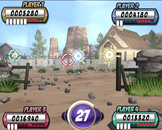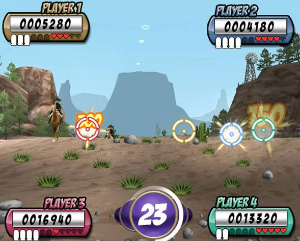 Wii Points: 500The ultimate cowboy gun game for 1-4 players. Howdy, partner, and welcome to Big Town Shoot Out. If you’re a sharpshooter with an itchy trigger finger, you’ve come to the right place. Big Town Shoot Out will take you through 40 increasingly challenging stages, across 10 zones and 10 different game types, all playable by up to four players simultaneously (additionally accessories required and are sold separately). Are you cowboy enough to make it through? As my old pa used to say, risk everything, fear nothing and have no regrets. It may not be the easy way, but it’s the cowboy way. Game types include: Train Trouble, Saloon, Windmill, Ranch, Mine, Street Scene, Boot Hill Cemetery, Outlaw Camp, Western Diorama and Turning Cards.