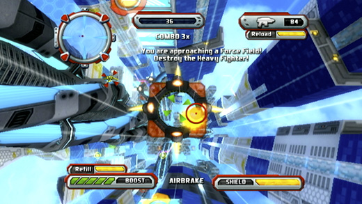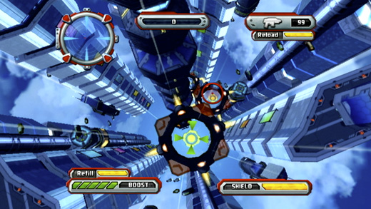 Adjust your velocity while maneuvering around buildings and automated fire in a 360-degree immersive skydive simulation. Pick up weapons and bonuses, and feel the thrill of blasting robot ships as you rush towards your jump target.